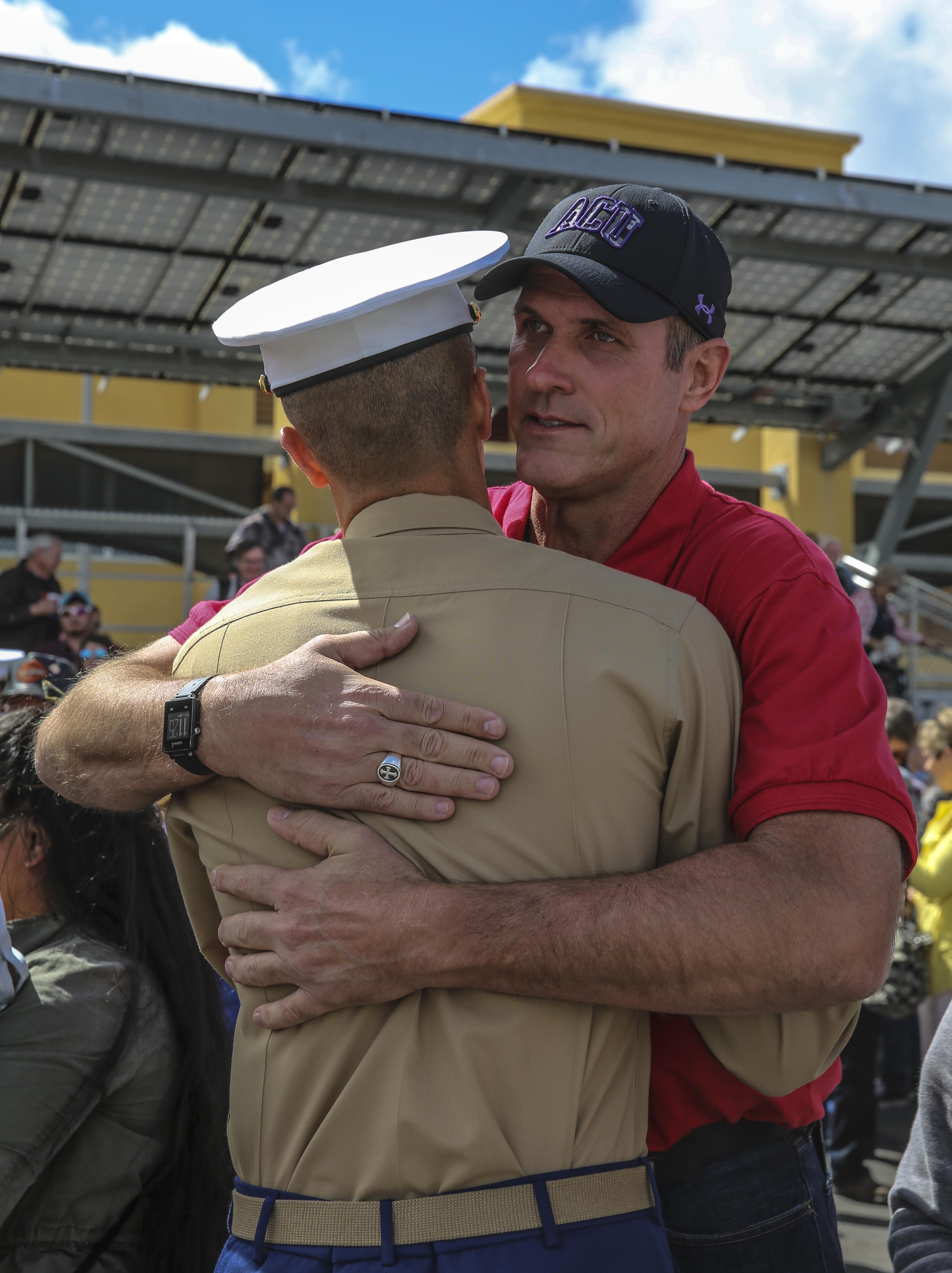 Marine Corps Recruit Depot San Diego - A Marine from India Company, 3rd Recruit Training Battalion, greets his loved one after graduating from recruit training at Marine Corps Recruit Depot San Diego, March 11. After graduation, all Marines are given 10 days of leave before taking the next step in training. Annually, more than 17,000 males recruited from the Western Recruiting Region are trained at MCRD San Diego.