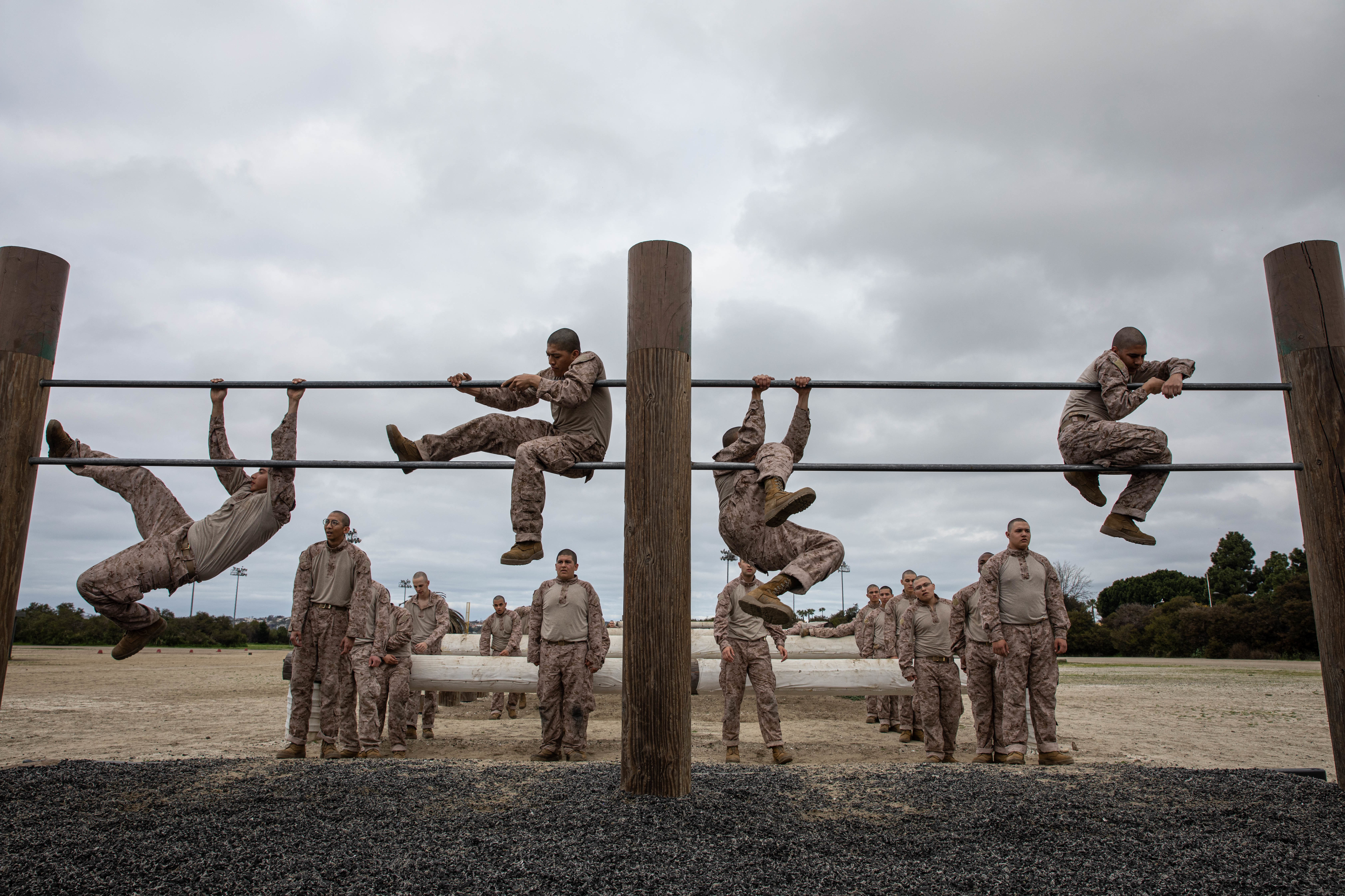 MARINE CORPS RECRUIT DEPOT SAN DIEGO, Calif. - U.S Marine Corps recruits with Kilo Company, 3rd Recruit Training Battalion, participate in an obstacle course training event at Marine Corps Recruit Depot San Diego, California, Feb. 29, 2024. The o-course includes obstacles that recruits must overcome to enhance strength, agility, and confidence. (U.S. Marine Corps photo by Lance Cpl. Sarah M. Grawcock)