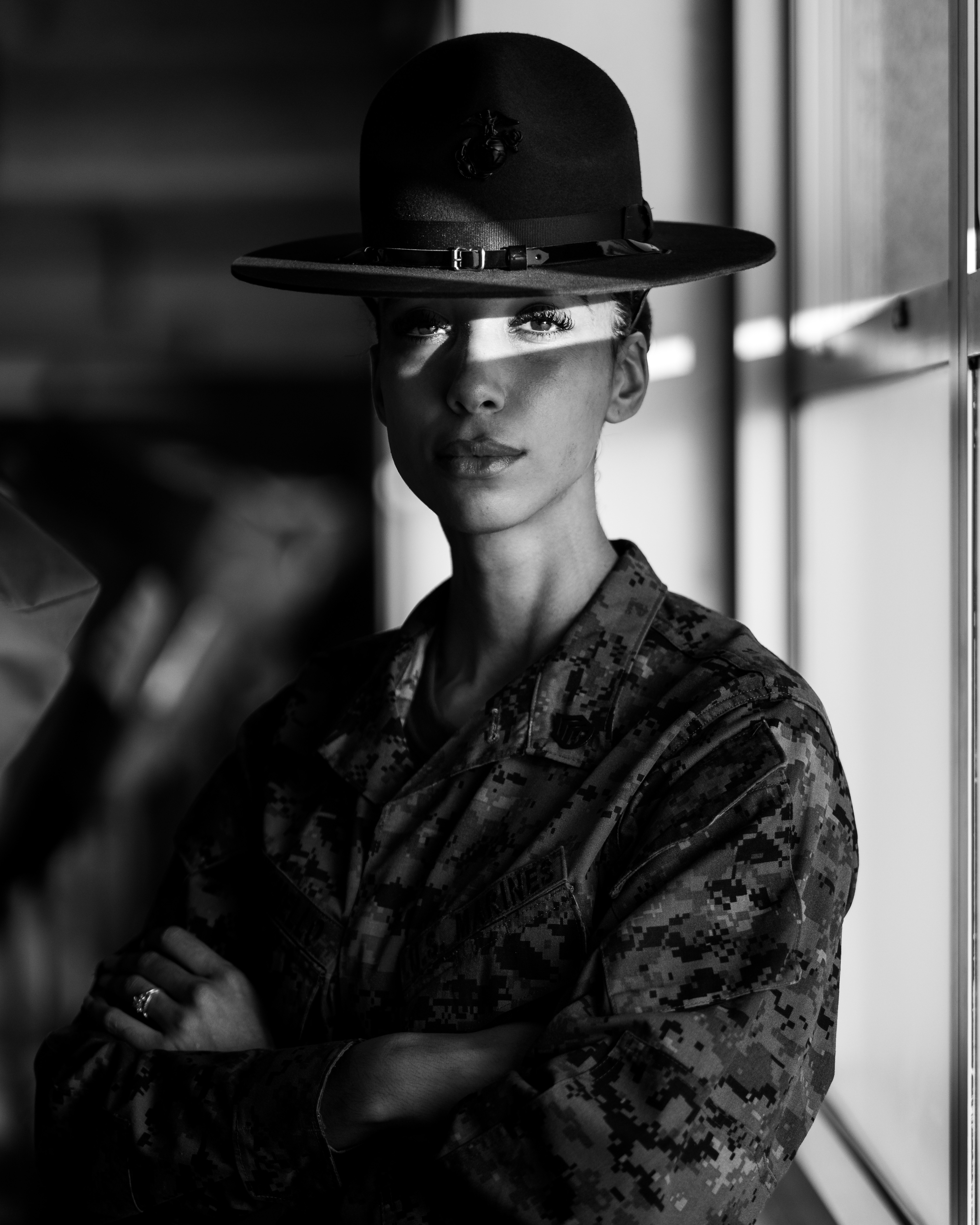 Marine Corps Recruit Depot, San Diego - U.S. Marine Corps Staff Sgt. Nicole Recenello, a drill instructor with Echo Company, 2nd Recruit Training Battalion, poses for a portrait during pick up at Marine Corps Recruit Depot, San Diego, Dec. 5, 2025. Recruits were introduced to their drill instructors and gained an understanding of the rules and expectations set for their training. (U.S. Marine Corps photo by Sgt. Patrick King)