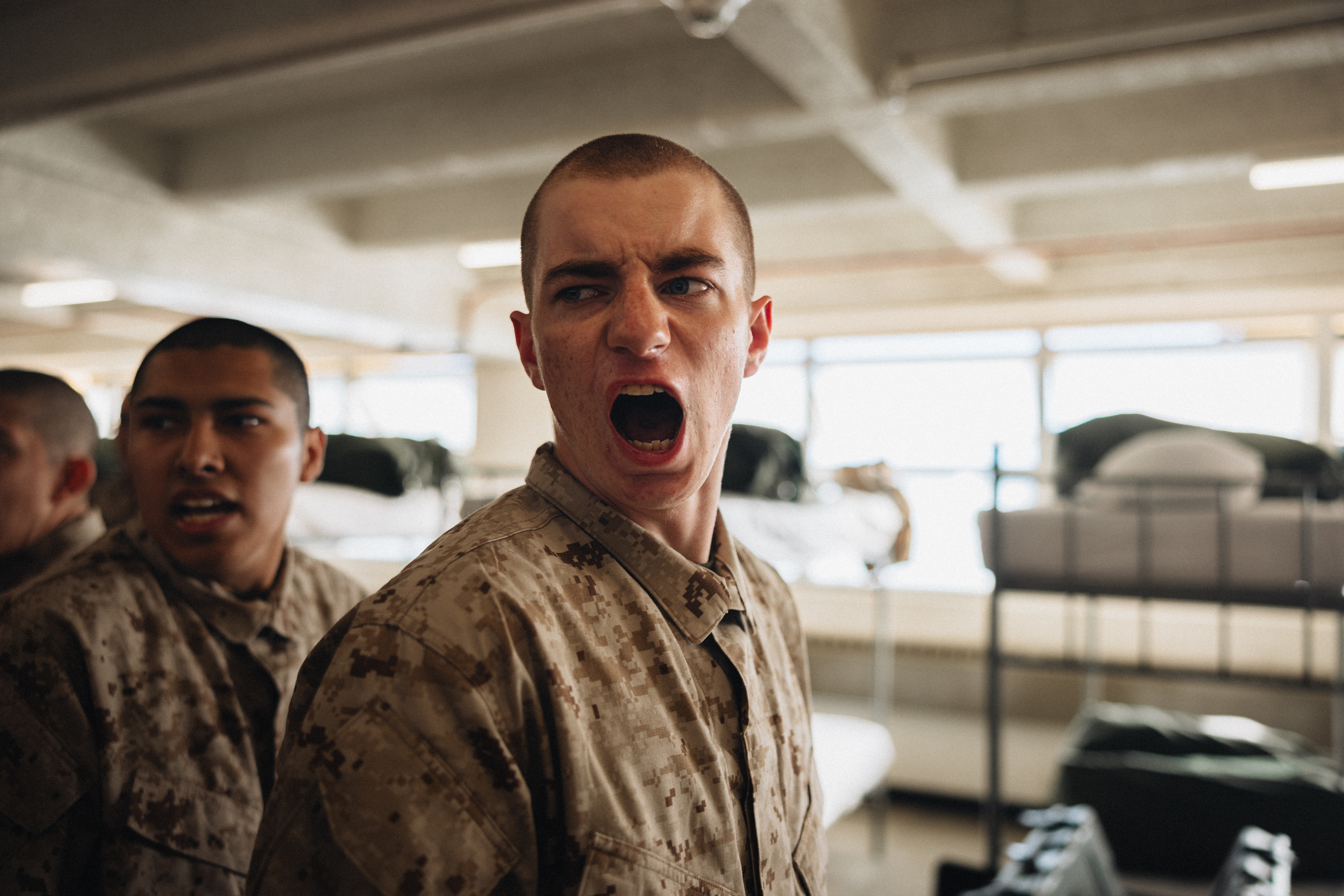 Marine Corps Recruit Depot, San Diego - A U.S. Marine Corps recruit with Echo Company, 2nd Recruit Training Battalion, responds to instructions during pick up at Marine Corps Recruit Depot, San Diego, Dec. 5, 2025. Recruits were introduced to their drill instructors and gained an understanding of the rules and expectations set for their training. (U.S. Marine Corps photo by Sgt. Patrick King)