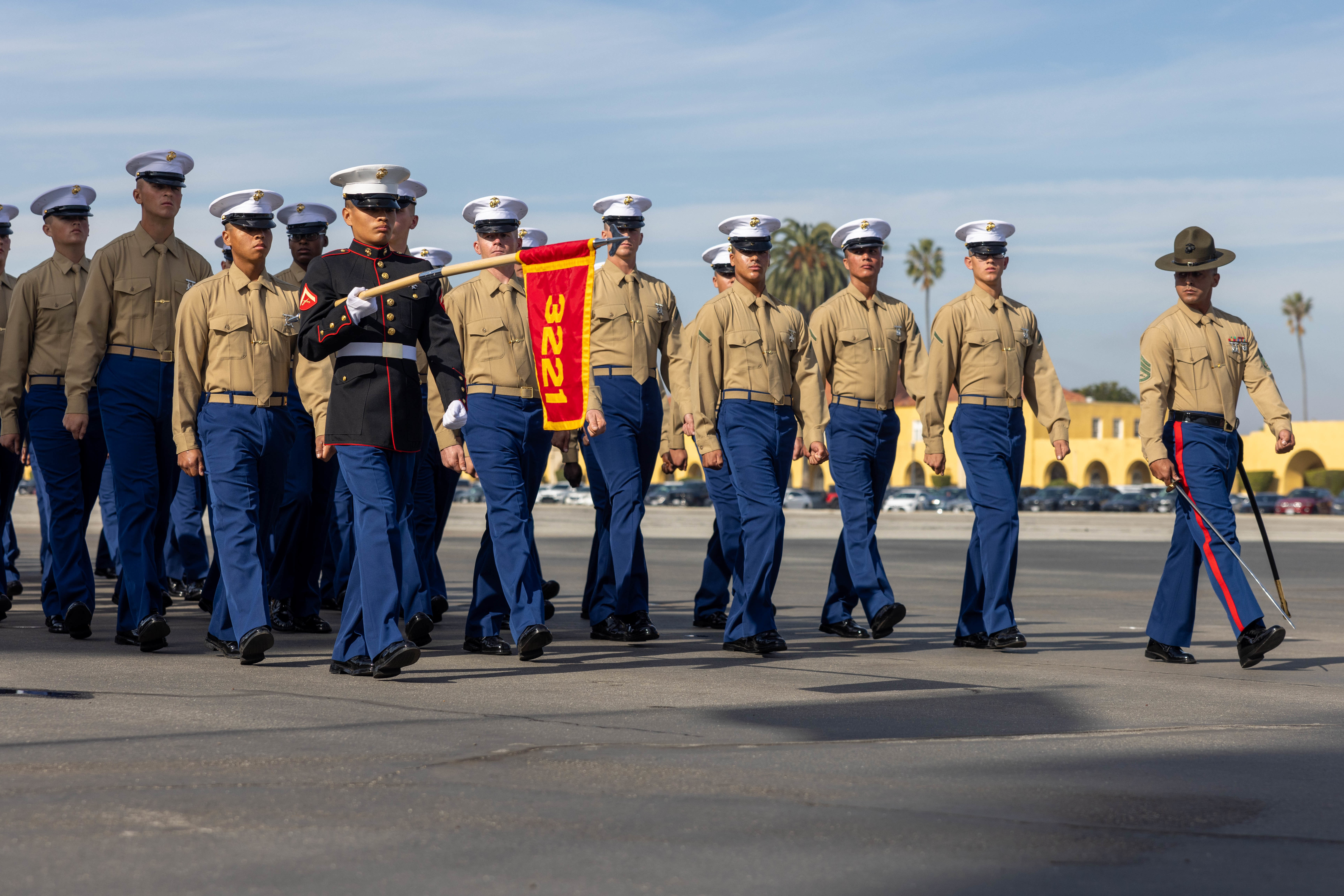 Marine Corps Recruit Depot San Diego, California - U.S. Marines with Kilo Company, 3rd Recruit Training Battalion march in formation during a graduation ceremony at Marine Corps Recruit Depot San Diego, California, Dec. 12, 2025. This ceremony marked the end of a 13-week transformation that included training in drill, marksmanship, basic combat skills, and Marine Corps customs and traditions. (U.S. Marine Corps photo by Lance Cpl. Jacob B. Hutchinson)