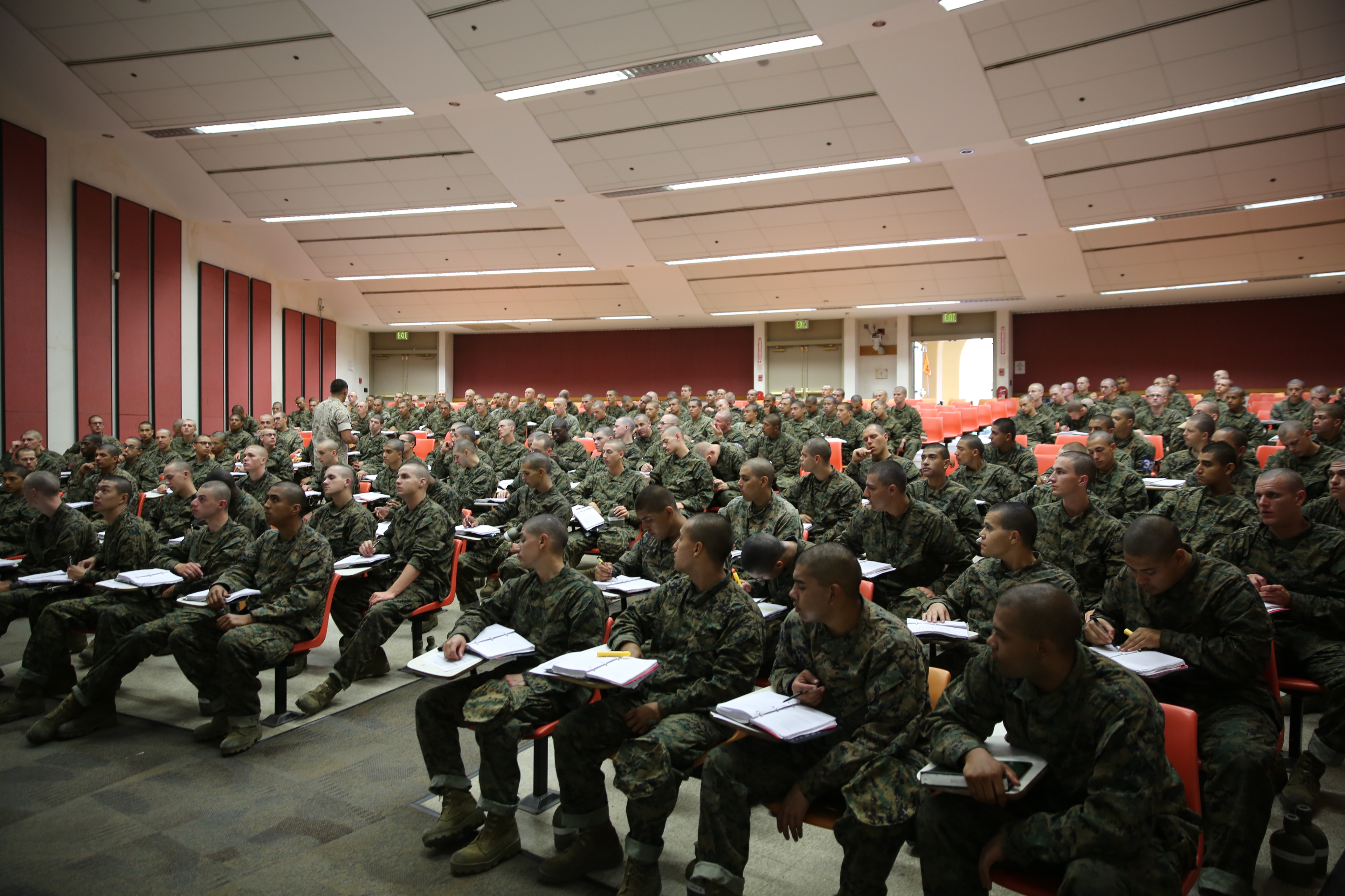 Recruits of Company I, 3rd Recruit Training Battalion, attended a class to learn about the UCMJ regulations aboard Marine Corps Recruit Depot San Diego, May 19.