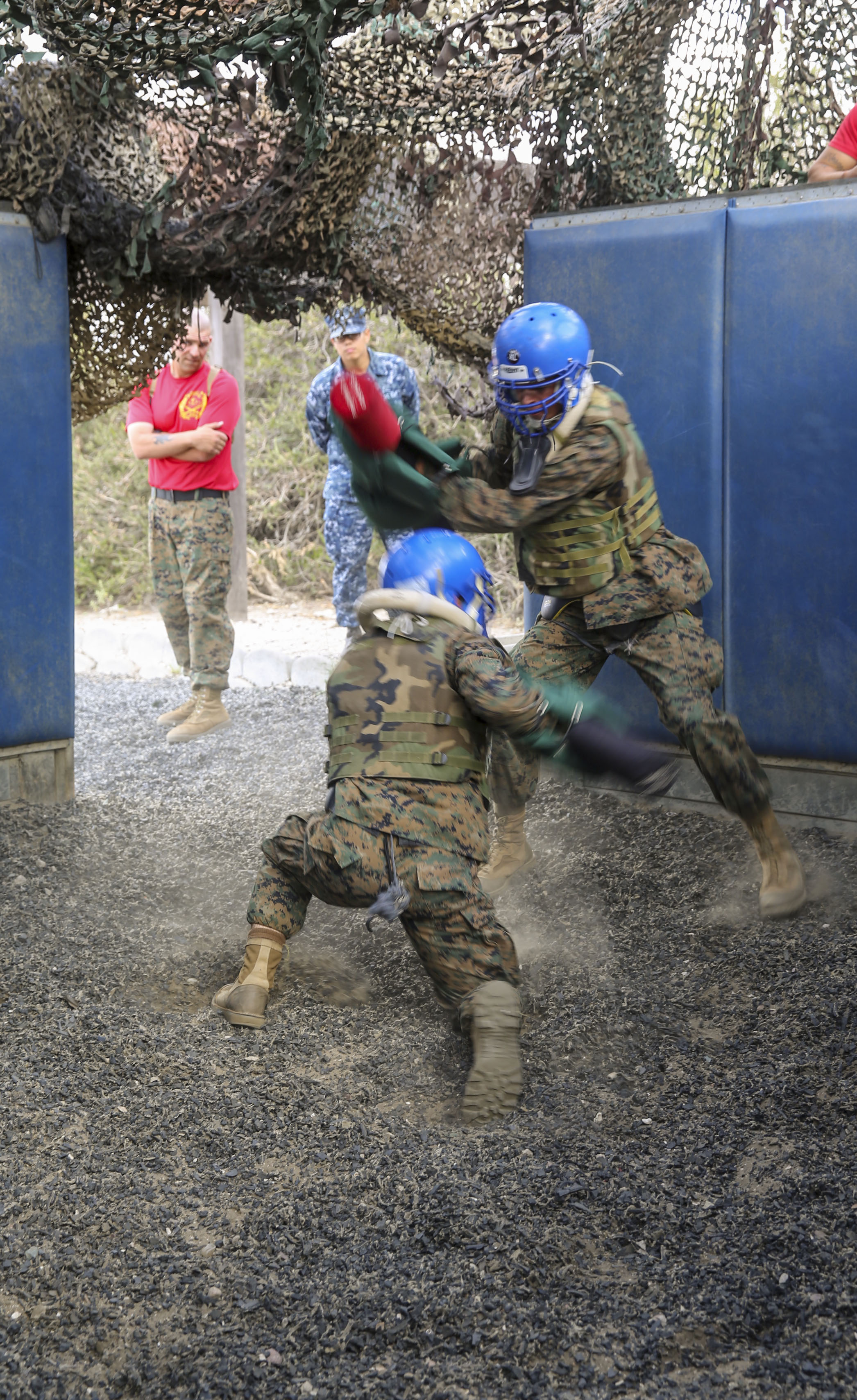 “You really had to find enough courage to go up against someone else in a situation like that,” said Recruit Beau J. Berg, Alpha Company. “It was a different experience, but I think it was very important for us to go through. This is what Marines have to deal with in combat, and we were fortunate to have the opportunity to undergo [Marine Corps Martial Arts Program] training.”