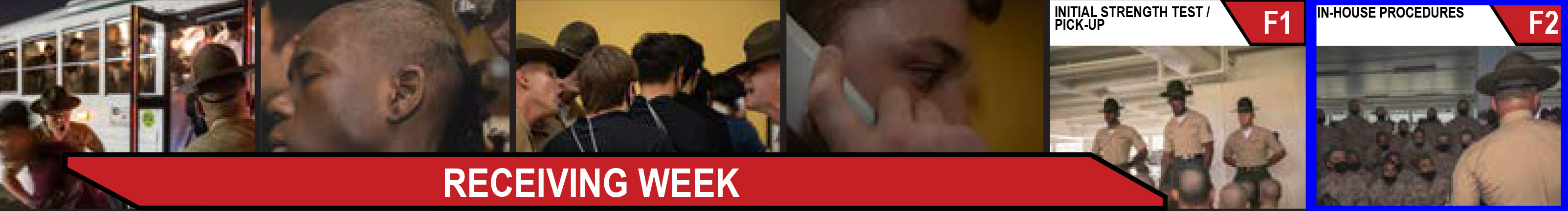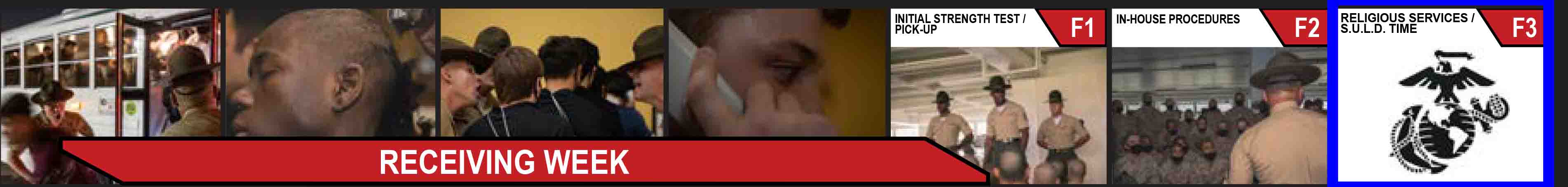 Receiving week is when the recruits arrive at the depot and represents the first step in the process of joining a recruit to the Marine Corps. Receiving Drill Instructors will begin the indoctrination to military life by introducing the following basic military knowledge (In-House Procedures): Wake up procedures, head call procedures, hydration guidance, mess hall procedures, customs and courtesies, squad bay security procedures, and sexual assault prevention and procedures. During the receiving process recruits are checked for contraband, given haircuts, make a scripted phone call home, and are issued their gear required for training.