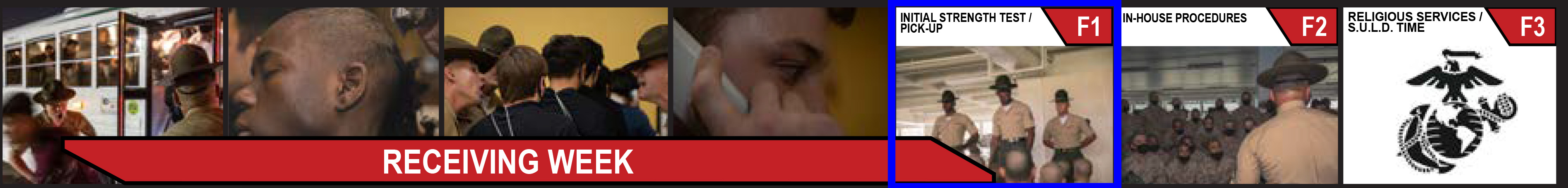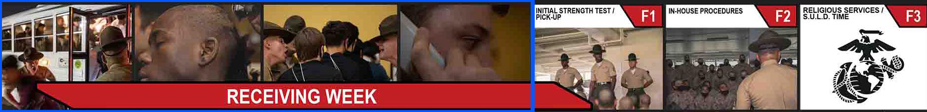 Receiving week is when the recruits arrive at the depot and represents the first step in the process of joining a recruit to the Marine Corps. Receiving Drill Instructors will begin the indoctrination to military life by introducing the following basic military knowledge (In-House Procedures): Wake up procedures, head call procedures, hydration guidance, mess hall procedures, customs and courtesies, squad bay security procedures, and sexual assault prevention and procedures. During the receiving process recruits are checked for contraband, given haircuts, make a scripted phone call home, and are issued their gear required for training.